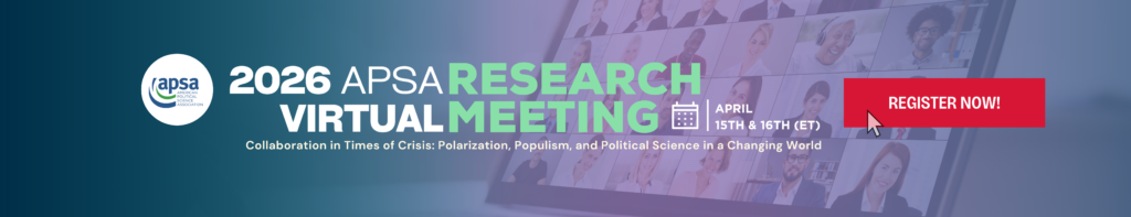 APSA welcomes political science scholars from all subfields and career stages to the 2026 APSA Virtual Research Meeting, on “Collaboration in Times of Crisis: Polarization, Populism, and Political Science in a Changing World,” held on Wednesday, April 15th & Thursday, April 16th, 2026 (ET)!