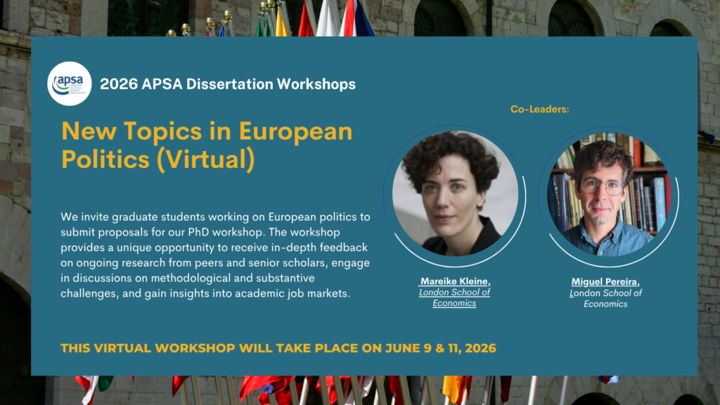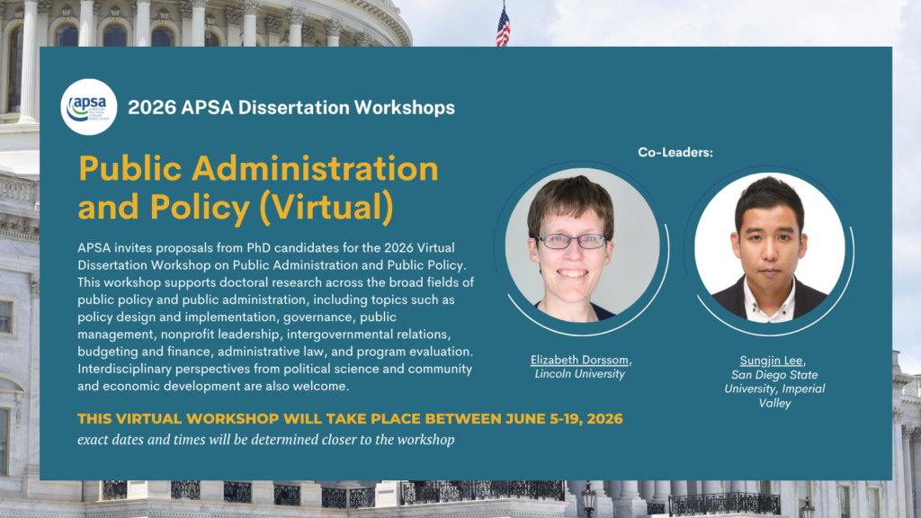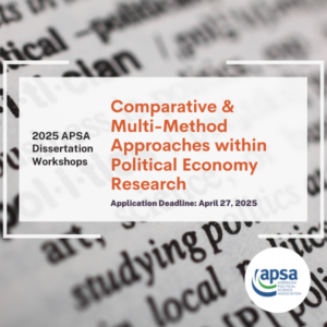 Join us for an in-person dissertation workshop held during the 2025 APSA Annual Meeting on Wednesday, September 10, 2025, in Vancouver, BC, Canada.