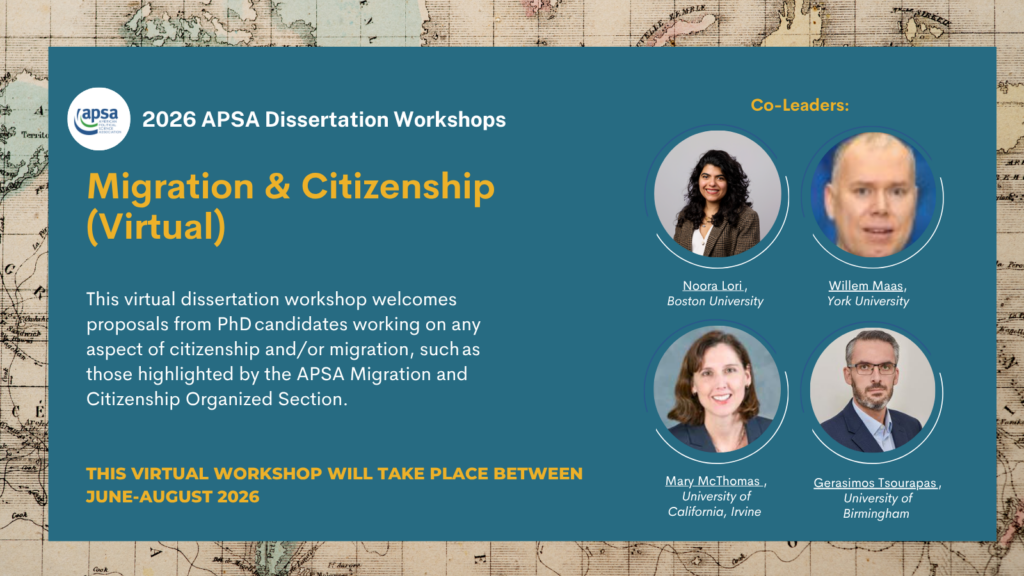 This virtual dissertation workshop welcomes proposals from PhD candidates working on any aspect of citizenship and/or migration, such as those highlighted by the APSA Migration and Citizenship Organized Section: