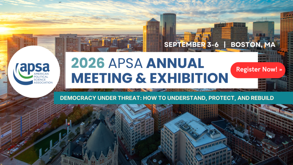 Join Scholars in Boston! Register now to join political scientists for the APSA 2026 Annual Meeting & Exhibition, held in Boston, Massachusetts, from September 3–6, 2026, to address the latest scholarship in political science and explore this year’s conference theme, “Democracy Under Threat: How to Understand, Protect, and Rebuild.”