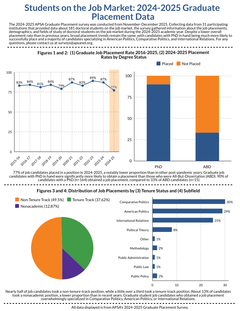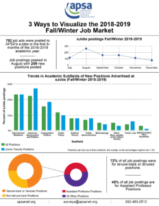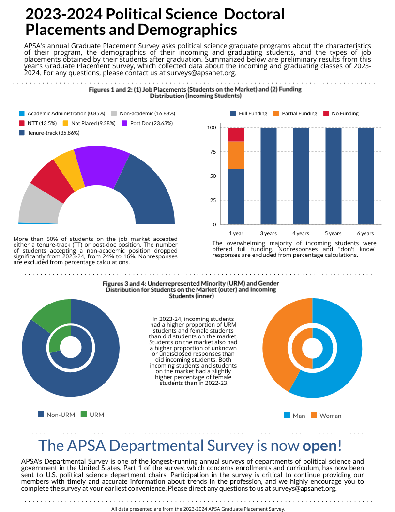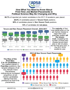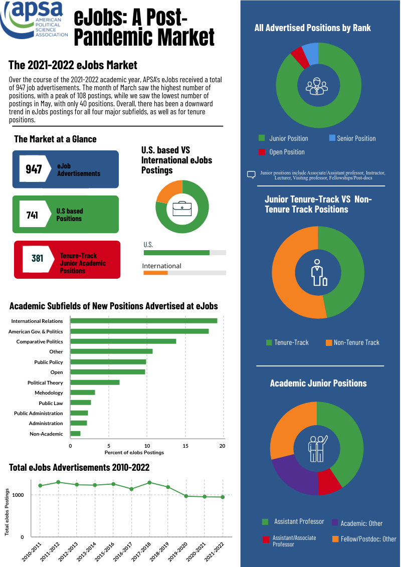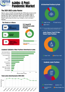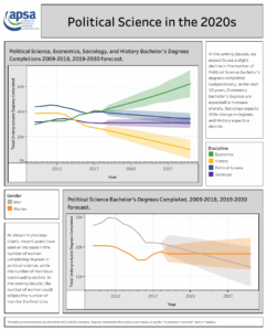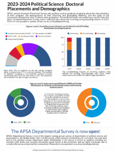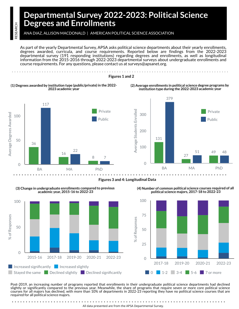 APSA’s Chart of the Month visually highlights key research findings and provides insights into other issues of relevance to the political science profession. Published each month since June 2016, Charts cover topics from teaching resources and undergraduate curriculum to eJobs and graduate placement. If you are interested in the data underlying these visualizations, please look at our public datasets page, or submit a data request form here.