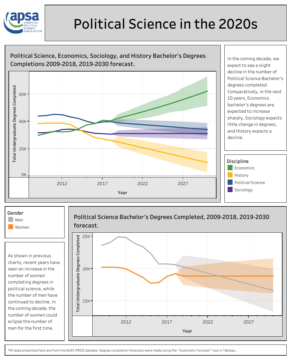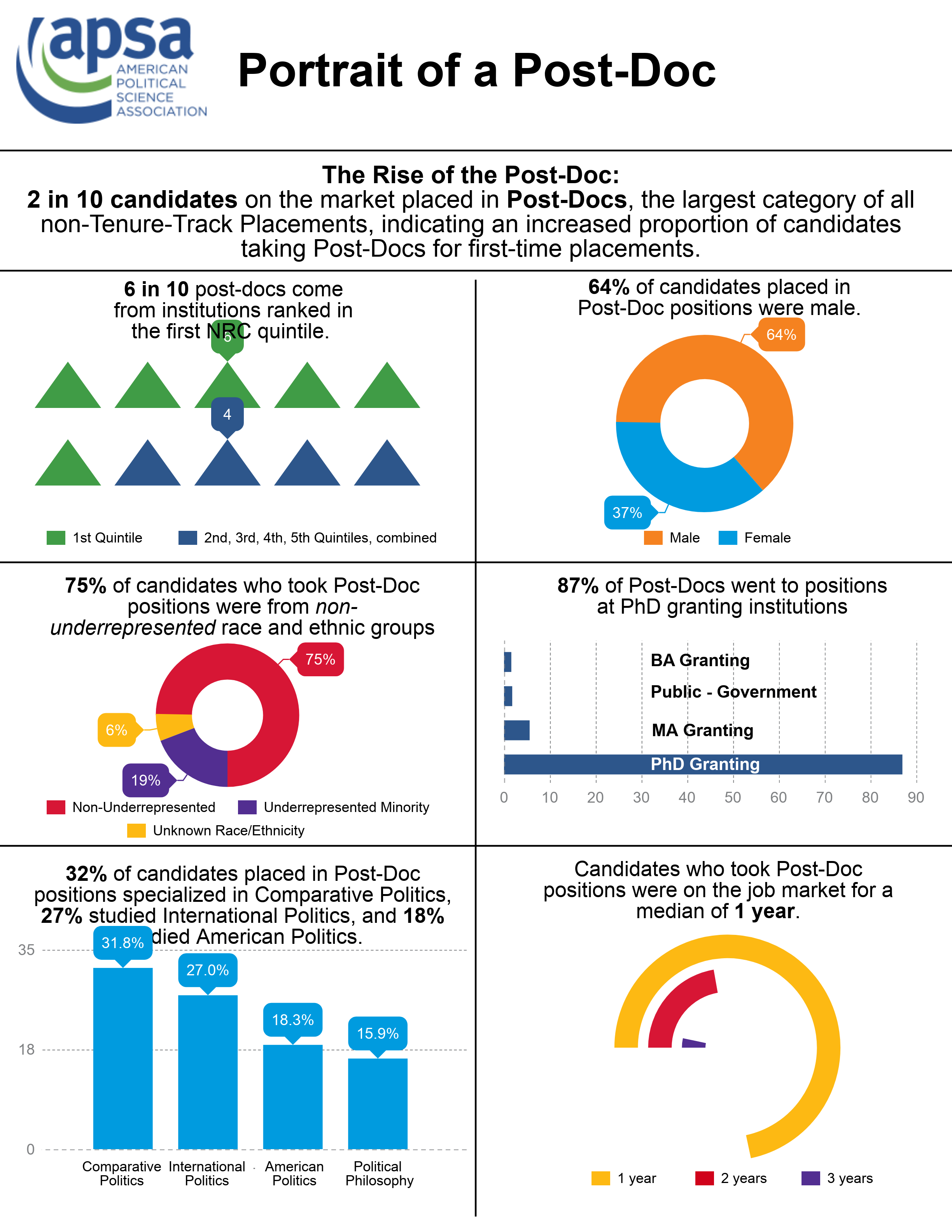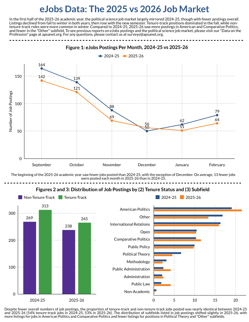 APSA’s Chart of the Month visually highlights key research findings and provides insights into other issues of relevance to the political science profession. Published each month since June 2016, Charts cover topics from teaching resources and undergraduate curriculum to eJobs and graduate placement. If you are interested in the data underlying these visualizations, please look at our public datasets page, or submit a data request form here.