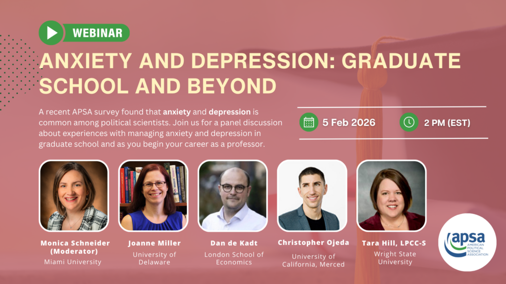 A recent APSA survey found that anxiety and depression are common among political scientists. Join APSA for a panel discussion about experiences with managing anxiety and depression in graduate school and as you begin your career as a professor. This professional development event is co-sponsored by the APSA Committee on the Status of Disability in the Profession and APSA Committee on the Status of Graduate Students in the Profession.