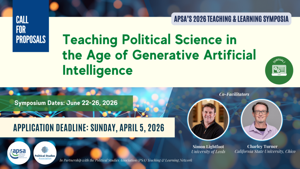 APSA is pleased to announce three calls for proposals for its 2026 Teaching and Learning Symposia. APSA’s Teaching & Learning Symposia provide a unique opportunity for faculty with similar teaching interests to present on timely substantive issues in the field, share best practices, and develop new teaching resources.